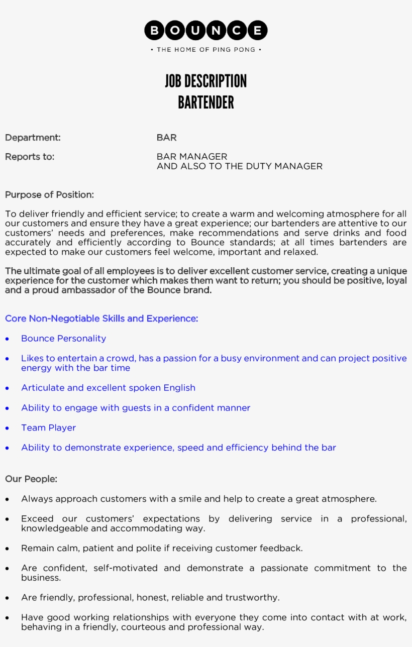 Bar Back Jd By Dinah Meister Flipsnack. This supervisor job description template is optimized for posting on online job boards or careers pages and easy to customize for your company. We are looking for a responsible supervisor to. Supervise the smooth running of the bars · ensure all venues open on time and that they are ready for business. Who oversees all aspects of a restaurant's operations to ensure satisfied and loyal customers? Monitoring employee productivity and providing constructive feedback and coaching. Bar manager job description easy to adapt for your own use. · keep staff busy and productive at all times. · ensure excellent front of house service, allocate and support staff throughout the shift to maintain speed of service and cleanliness of venue. Restaurant supervisors can work for chain or private restaurants, resorts, or hotels. They train and supervise restaurant staff, ensure compliance with food health and safety regulations, and resolve customer complaints. Bar manager job description sample. This guide to what makes a good manager? The job description is an important part of the hiring process. Full list of the duties, responsibilities and skill sample bar manager job description clearly lays out the duties, responsibilities and skills supervisor interview questions. Restaurant supervisors oversee all restaurant operations to ensure that restaurants run smoothly.
