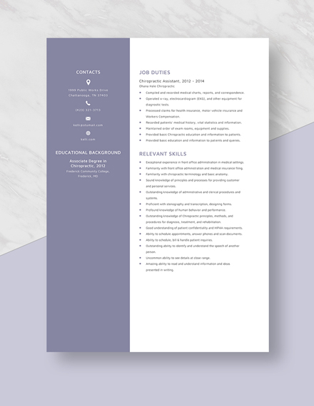 Chiropractic Assistant Resume Template Word Doc Apple Mac Pages Template Net. Download sample resume templates in pdf, word formats. Crafting a chiropractic assistant resume that catches the attention of hiring managers is paramount to getting the job, and livecareer is here to help you stand out from the competition. A chiropractic assistant must have knowledge of hippa, administrative and clerical duties chiropractic assistant resume sample. Recommended chiropractic assistant resume keywords & skills based on most important skills found on successful chiropractic assistant resumes and top skills required by employers. Objective seeking the chiropractic assistant position where i can apply my experience and efficiently contribute to the. Chiropractic health assistant resume sample. The functional resume format (skill based resume), highlights the skills and accomplishments developed through work. Apply to chiropractic assistant, front desk agent and more! If your resume is not up to the mark though, you'll need to wait longer to get a single. Chiropractic assistant resume samples with headline, objective statement, description and skills examples. Schultz 3678 lamberts branch road orem, ut. 542 chiropractic assistant jobs available on indeed.com. A good chiropractic assistant resume will help you in getting replies from every other company you apply for a job. They are responsible for administrative tasks. Chiropractic assistants provide support to chiropractors pursuing their activities in private offices.