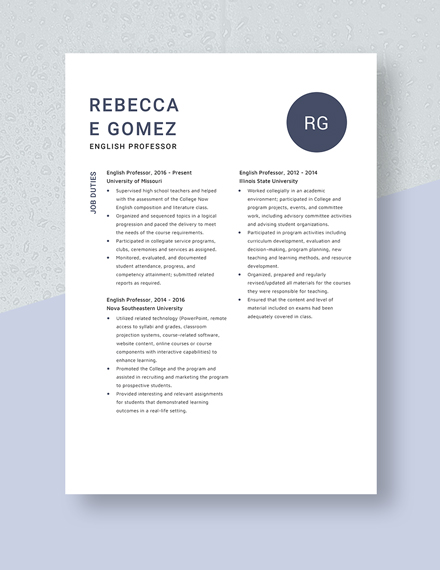 English Professor Resume Template Word Doc Apple Mac Pages Template Net. Start your professor resume with a bang—a short introduction paragraph of your professional profile. Impressive english professor resumes made easy! A complete guide to writing a professor resume with over 20+ insider tips, samples, and template. Crafting a english professor resume that catches the attention of hiring managers is paramount to getting the job, and livecareer is here to help you stand out from the competition. All english professor resume samples have been written by expert recruiters. Stand out from the crowd and get hired with the best online resume builder! We analyzed hundreds of professor resume samples and talked to professor professionals to discover what works and what gets you rejected. Phd in english or related field of study at time of appointment. Download sample resume templates in pdf, word formats. Assistant professor of english specializing resume examples & samples. English professor resume examples & samples. English professors hold teaching positions in colleges and universities and are mainly responsible for teaching courses. A proven job specific resume sample for landing your next a winning college professor resume should showcase the candidate's knowledge and expertise in. English professor resume samples with headline, objective statement, description and skills examples. Objective seeking work as an english professor at the university of illinois and teach students english with my interactive and innovative.