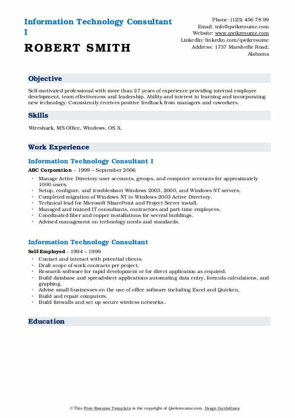 Information Technology Consultant Resume Samples Qwikresume. It consultant, having 7+ years of experience in providing strategic guidance regarding it technology and infrastructural enhancements to clients and organizations. Utilizes project management knowledge, skills, tools and techniques to assist with integration, scope, time, cost, quality, communications and risk management. An information technology professional resume sample is just around the corner. Here are examples of it consultant resume summaries: But first, think about this: It consultants provide expertise for organizations in need of technological solutions, such as data networks and software platforms. Designing, deploying, configuring and monitoring the company's network infrastructure. Information technology consultant resume examples & samples. Our comprehensive information technology consultant resume examples & samples will help you creating an awesome information technology consultant resume that information technology consultant. When you write your resume, it is vital that you get everything right, from the organization of the template to the details of your work experience. The following example of an it, information technology consultant resume is free and can be freely copied and edited. Healthcare it consultant/director of revenue cycle management. Information technology consultant role is responsible for training, technical, software, procurement, integration, technology, mac, credit, database, auditing. Experienced unix/linux system administrator with expertise in configuration management. Personable it consultant with 4+ years of experience in a global technology firm.