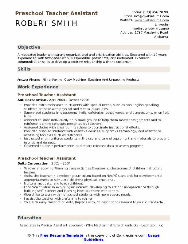 Preschool Assistant Teacher Resume Great Sample Resume. Preschool assistant teachers usually learn the ropes by working alongside a lead teacher. Most preschool teacher's assistants actually find jobs in the non profits and education industries. Includes interview questions, assistant handbook, and more! 16,676 open jobs for assistant preschool teacher. A preschool assistant teacher resume should show work with children. Printables and advice for working with a teacher assistant or paraprofessional. Apply to preschool teacher, substitute preschool teacher assistant jobs. Charismatic and dependable preschool assistant teacher with 8 years experience delivering educational assistance and instruction to 3 & 4 year old learners. Page 1 of 6,767 jobs. Get the right assistant preschool teacher job with company ratings & salaries.