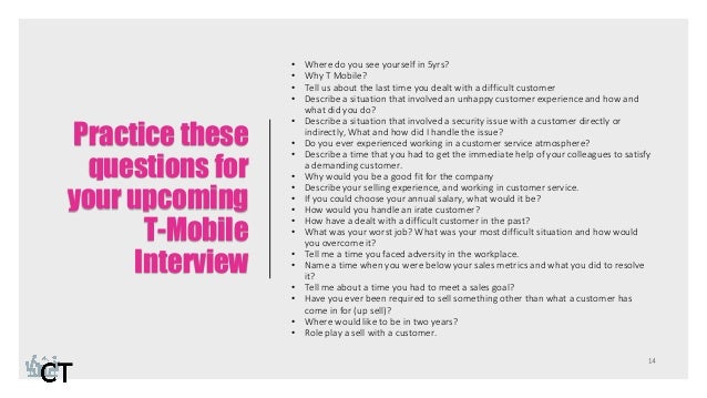 Been Applying To T Mobile For 3 Years And Finally Got A Response Has Anyone Attended A Talent Showcase In The Past What Should I Expect Any Tips For The Interview Thanks Ahead. Questions answers views company email. With an additional 62 professionally written interview answer examples. Second interview was with the hiring manager more going over background and what i had done. Focus on tailoring answers to themes such as adaptability interviewer: Give an example of an instance when you had to coach someone. However, with the right amount of preparation you can ace the interview. What is the work environment and culture like? Initial meeting was a recruiter, they set up an assessment test. Many questions presented regard previous work history. Please describe your job title and primary duties. We all know interviews are stressful and competition is intense. How are the working hours? My job title is sales associate. How to write test case from the ms word on creating a new document called good world ? First interview was with hr general screening questions.