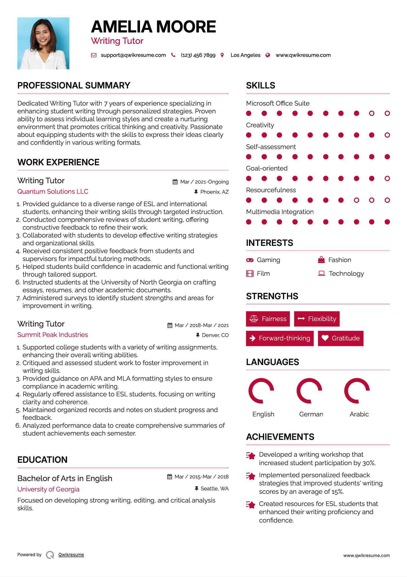 Writing Tutor Resume Samples Qwikresume. Professional samples, written by top hr executives. Typical example resumes for writing tutors emphasize duties like assessing student learning needs, explaining writing principles and concepts. A complete guide to writing a professional resume for a tutor. I founded resumeok in 2011, with the goal of helping people increase their chances to get a better job. Our free downloadable tutor resume sample and writing tips will help you impress students and their parents. 20+ examples and tips from our. A tutor resume example better than 9 out of 10 other resumes. Writing tutor resume examples & samples. Before you start writing, make sure you know how to write a resume in a way that best emphasizes your strengths. How to write a tutor resume that lands more interviews. Here are a sample tutor resume and cover letter, with tips for what you should be sure to include to increase your chances of landing a position. Writing a resume is like writing a story. 3 tips for crafting a great tutor resume. When writing your resume, be sure to include all your relevant education and credentials, as well as your professional experience. If your resume objective is the introduction then the work experience is the main body.